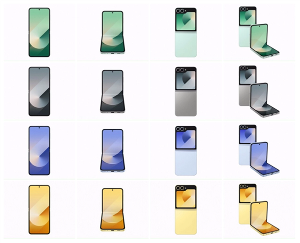 从图中可以看出,三星Galaxy Z Flip6共有4款配色,分别是绿色、银色、蓝色和黄色,预计与Z Flip5相同,均为三星商城专属配色。