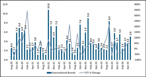 苹果5月份的销售额同比下降了8%。然而,在2024年1月,苹果的销售额同比下降了38%。