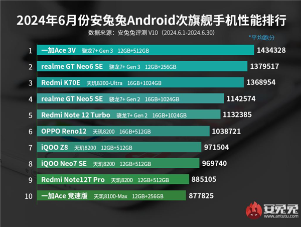 快科技7月1日消息,安兔兔今日公布了2024年6月的安卓次旗舰手机性能榜,一加Ace 3V成功拿下榜首。