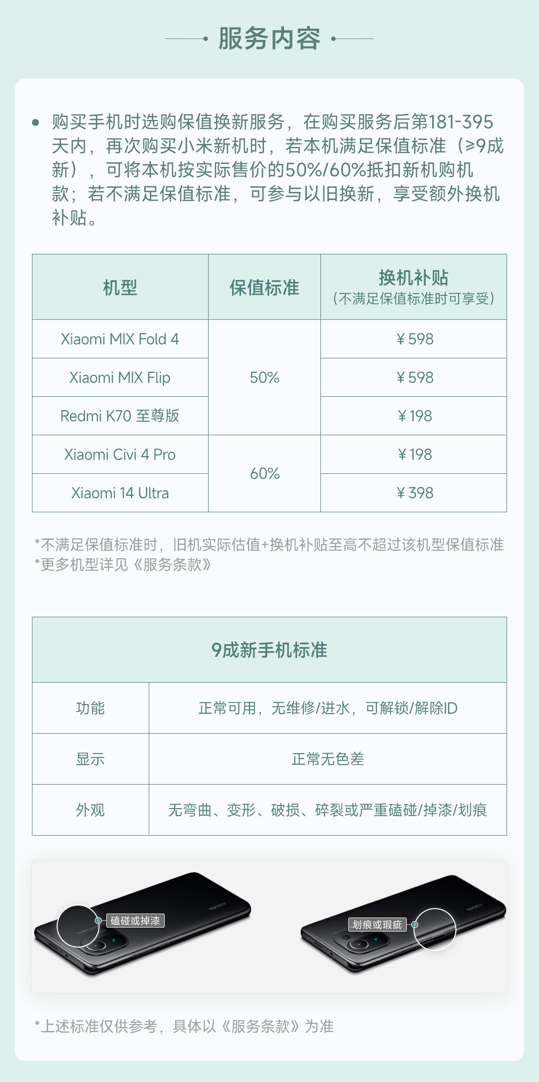 IT之家注意到,小米 MIX Fold 4 和 MIX Flip 两款手机已上线小米保值换新服务。在拥有服务后第 181-395 天内,再次购买小米新机时,若本机满足保值标准 (≥9 成新),可将本机按实际售价的 50%/60% 抵扣新机购机款;若不满足保值标准,可参与以旧换新,享受额外换机补贴。