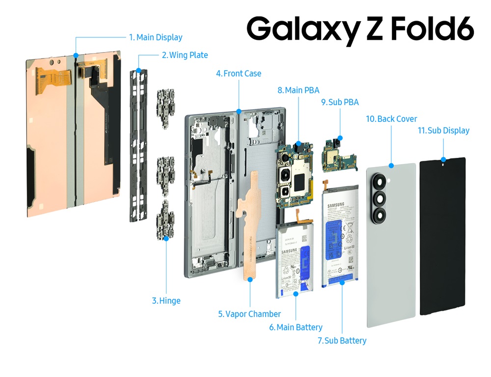 Galaxy Z Fold6 作为一款折叠屏手机,内部结构极其紧凑,几乎没有空余空间。新铰链(3)使得 Z Fold6 在折叠时比前代薄了 1.3 毫米,同时使用了强化材料,确保铰链依然坚固耐用。翼板(2)不仅保护显示屏免受损坏,还帮助其顺畅折叠和展开。