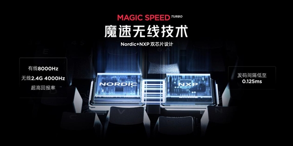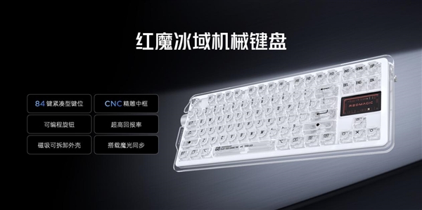 除此以外,红魔还带来首款主机手柄幻刃,采用0死区霍尔摇杆,有线回报率达1000Hz,操作丝滑,走位精准,售价349元;红魔冰域机械键盘,搭载MAGIC SPEED TURBO无线技术,回报率高达8KHz,CNC精雕工艺打造,采用84键紧凑布局,独立方向键以及可编程旋钮提升操作便捷性,三种配色可选,并可替换磁吸上盖,暗夜骑士、氘锋银翼版售价 999元,氘锋透明售价1099元;红魔磁吸音箱,搭配透明炫彩灯效,外观个性十足,支持蓝牙5.3,内置400mAh电池,续航长达6小时,适用多种场景,售价109元,首销福利价99元。