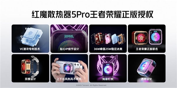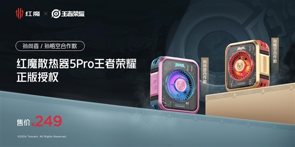 红魔电竞宇宙新品还带来基于VC液冷专利散热技术的红魔散热器5 Pro王者荣耀正版授权合作款,首推孙悟空与孙尚香两个版本,均采用机甲皮肤进行了深度设计,售价249元。