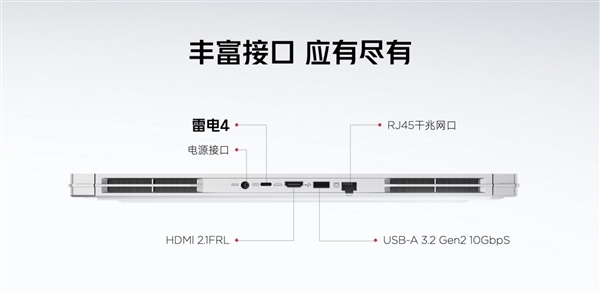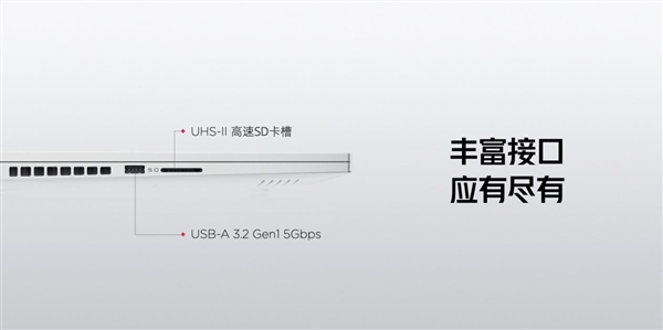 接口方面全面满足外接与扩展需求,配备雷电4接口,可以同时支持1台8K和2台4K显示器的高清输出,支持40Gbps高速传输、100W PD快充及多屏输出,另设HDMI 2.1接口,满足高端显示需求。除此还配有1×USB-A 3.2 Gen2、2×USB-A 3.2 Gen1、千兆网口、3.5mm耳麦接口、UHS-Ⅱ高速SD卡槽及充电口。