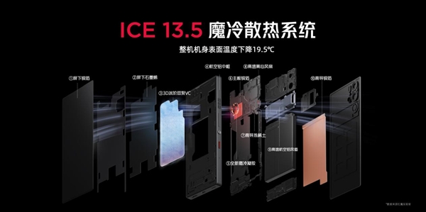 拥有性能如此出众的超强芯片,要满血输出散热必须跟上。搭载ICE 13.5魔冷散热系统,独创大面积万级冰阶VC,风冷升级,风道均热面积提升100%。全新转速达22000转合金鲨鱼鳍风扇,铸就红魔卓越的散热效能。