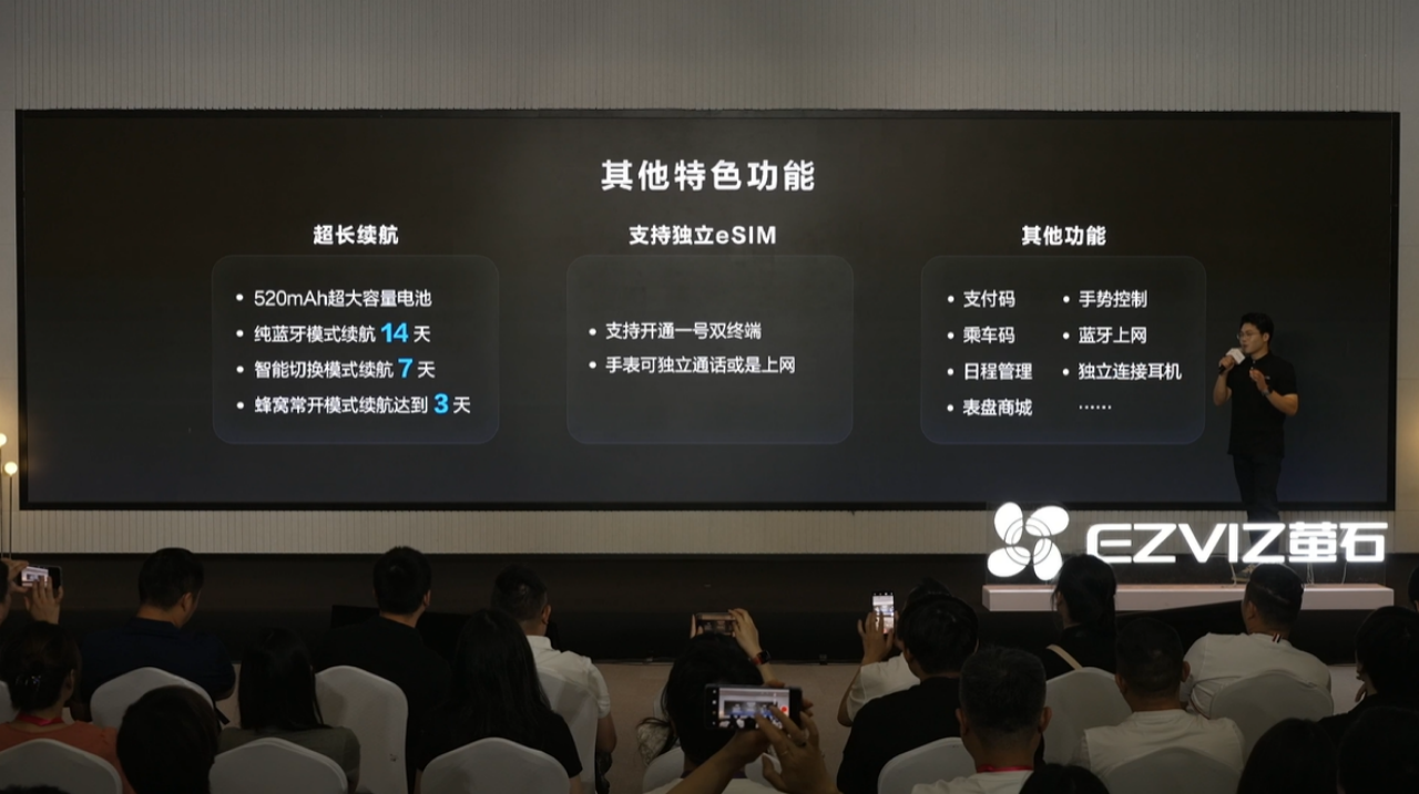 萤石智能健康手表 WA1S 内置 520mAh 电池,纯蓝牙模式续航 14 天,智能切换模式续航 7 天,蜂窝常开模式续航约 3 天,支持独立 eSIM。