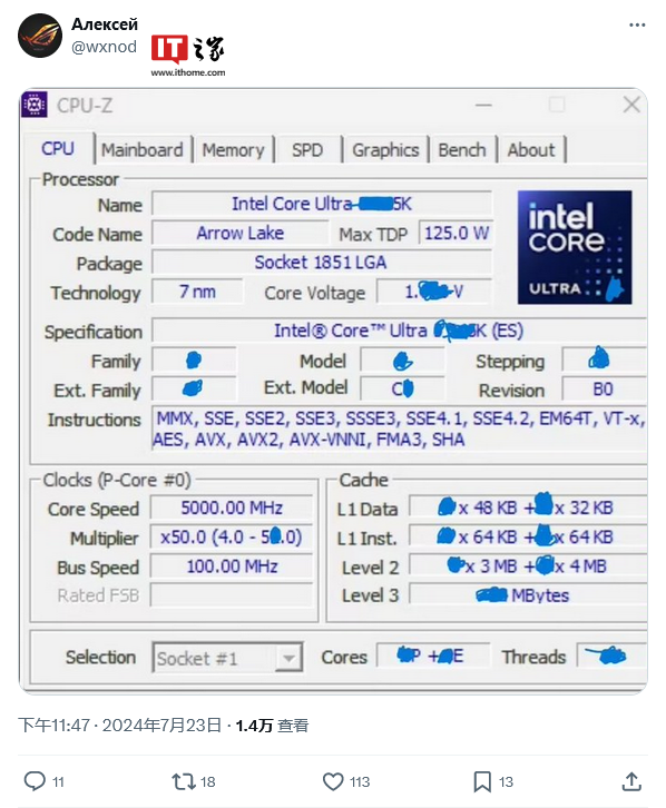 IT之家 7 月 24 日消息,消息源 @wxnod 昨日(7 月 23 日)发布推文,分享了一张 CPU-Z 截图,展示了英特尔酷睿 Ultra 9 285K“Arrow Lake-S”处理器的相关信息。