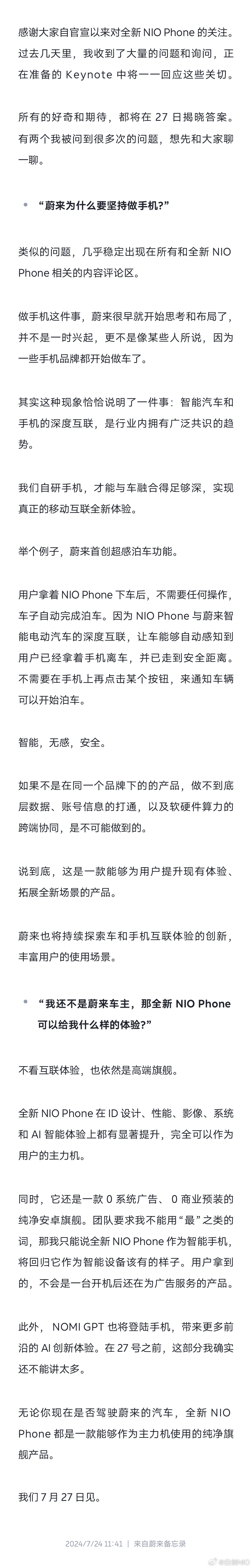IT之家 7 月 24 日消息,蔚来 NIO Phone 2 代将在 7 月 27 日的蔚来创新科技日发布,蔚来汽车科技副总裁 @白剑NIO 今日发文,对新机进行了一些预热。