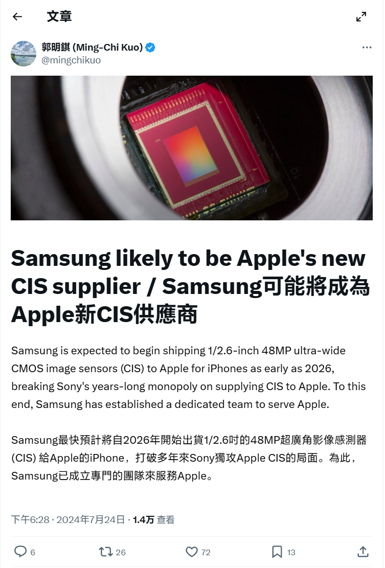 IT之家 7 月 24 日消息,郭明錤今日傍晚在 X(推特)上发文透露,三星最快预计将于 2026 年开始向苹果 iPhone 出货 1/2.6 吋的 48MP 超广角图像传感器(CIS),打破多年来索尼独供苹果 CIS 的局面。