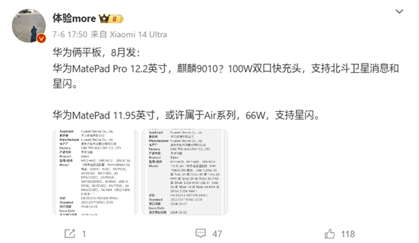 快科技7月8日消息,据博主“体验more”爆料,预计华为8月会有两款平板登场,分别是MatePad Pro 12.2、MatePad 11.95。