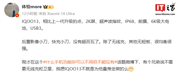 IT之家 7 月 25 日消息,博主 @体验more 昨日爆料称,iQOO 13 相比上一代升级“2K 屏、超声波指纹、IP68、前摄、6K 级大电池、USB3”。
