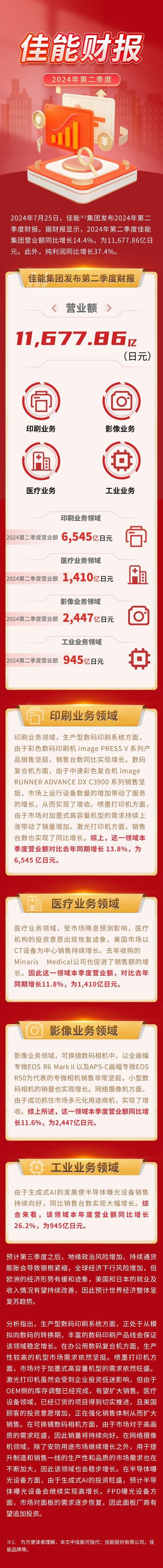 文章来源于互联网:凤凰网-佳能2024年第二季度营业额11678亿日元,影像业务2447亿日元同比增长11.6%