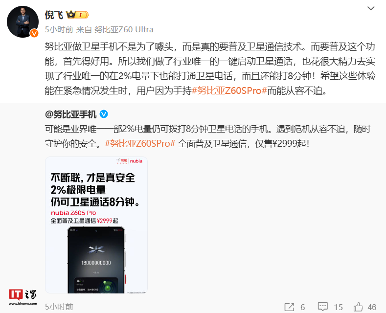 努比亚技术有限公司总裁倪飞称,努比亚做卫星手机不是为了噱头,而是真的要普及卫星通信技术。他表示,努比亚做了行业唯一的一键启动卫星通话,实现了行业唯一的在 2% 电量下也能打通卫星电话,而且还能打 8 分钟。