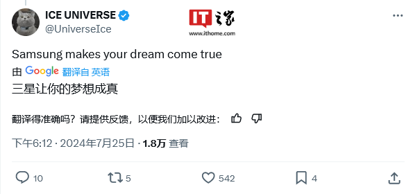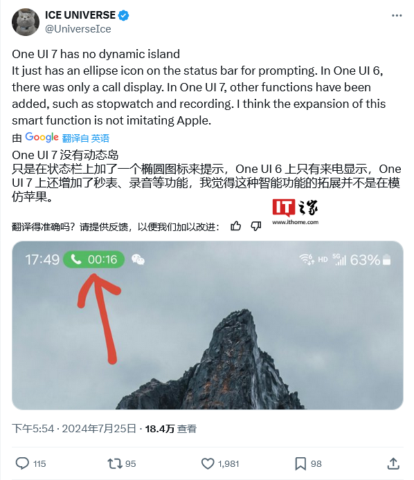 IT之家 7 月 26 日消息,消息源 @i冰宇宙 昨日(7 月 25 日)在 X 平台发布推文,表示三星 One UI 7 系统不会引入类似苹果 iOS 的灵动岛设计,只是在状态栏上用椭圆图标进行提示。