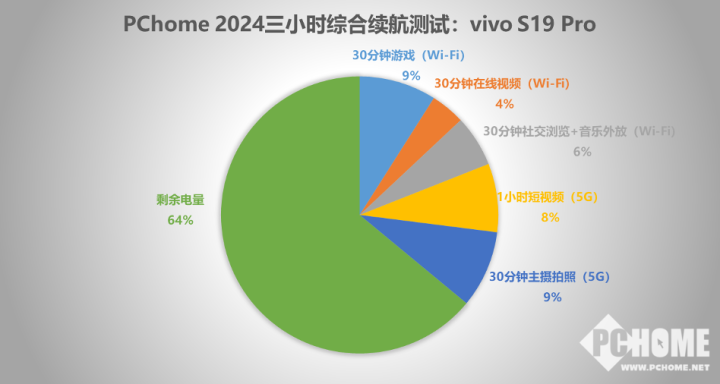 续航表现上,vivo S19 Pro配备了5500mAh大电池,与高能效表现的处理器配合,加之vivo在系统上的异构运算处理,整体续航表现不错。3小时续航实测,剩余电量64%,排在今年已测机型的第13位。