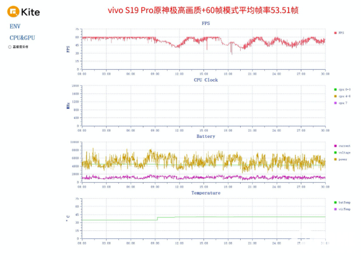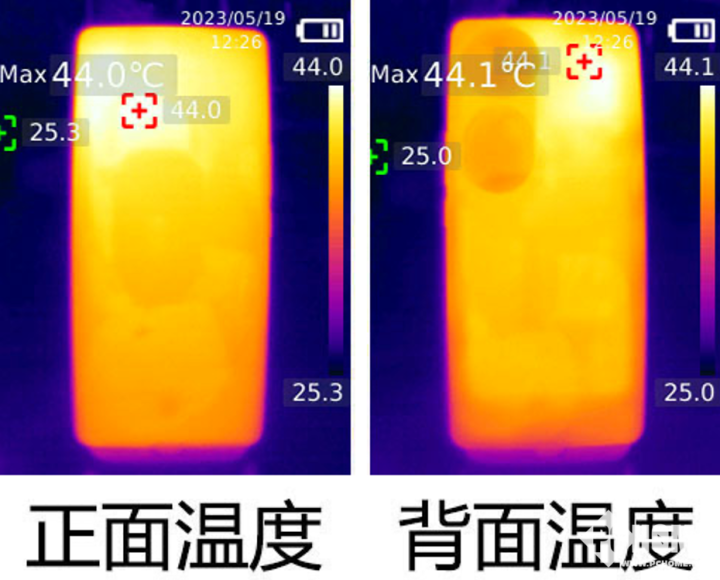 功耗和发热情况上,vivo S19 Pro平均功耗5.12W,排在所有已测机型的中游水平。正面最高温44度,背面最高温44.1度,没有触及到45度的红线。