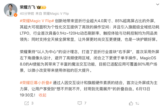 6月6日,荣耀终端有限公司产品线总裁方飞曝光了荣耀Magic V Flip的外屏参数,屏幕尺寸为4.0英寸,拥有85%超高屏占比的外屏,并且引入旗舰级全域低功耗LTPO,行业首次具备0.1Hz~120Hz动态刷新率。
