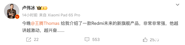 小米集团合伙人、总裁,国际部总裁,小米品牌总经理卢伟冰爆料称,王腾给自己介绍了一款Redmi未来的新旗舰产品,非常非常强,他越讲越激动。