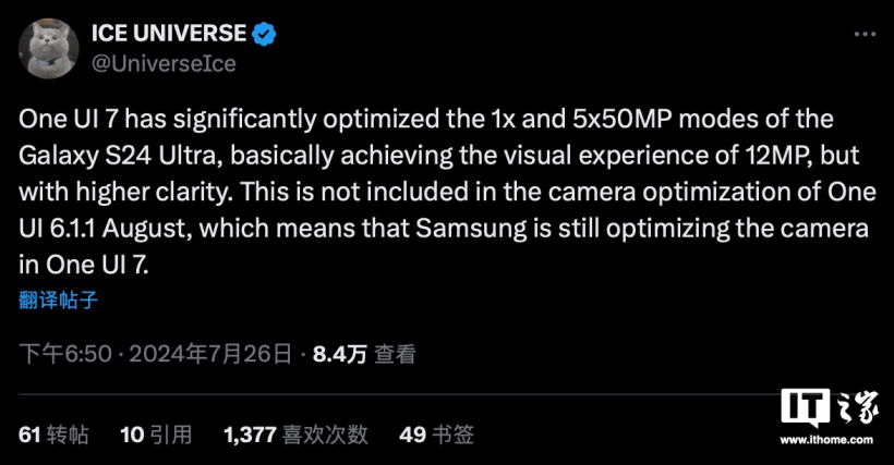 IT之家 7 月 27 日消息,博主 @i冰宇宙 今天在 X 平台透露,三星即将推出的 One UI 7 将显著提高 Galaxy S24 Ultra 手机的拍摄性能,主要围绕手机的主摄及长焦进行改进,有望提升相关镜头出片清晰度。