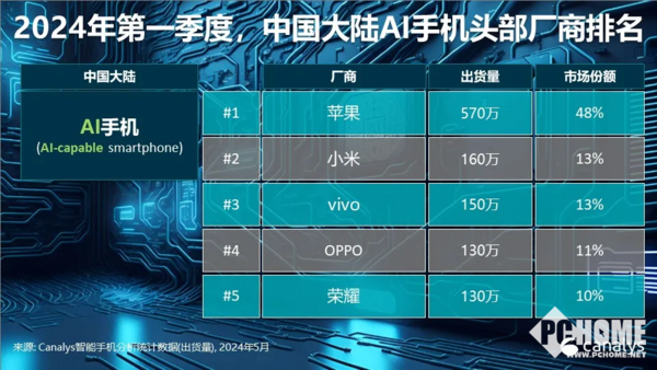 近日,Canalys发布了2024年一季度中国AI手机头部厂商排名,第一是苹果,出货量570万台,市场份额48%;第二到第五分别是小米、vivo、OPPO和荣耀。颇为讽刺的是,至今苹果都未曾为iPhone加入AI大模型相关功能,不知调研机构为何将其定为第一。此外,该榜单中,我们也未见到出货量井喷的华为。