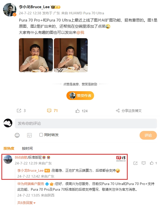 IT之家此前报道,华为终端 BG CTO 李小龙发文,晒出了自己使用“AI 扩图”体验,评论区有网友询问标准版是否会增加该功能,李小龙回复称“正在扩充云端算力,后续都会支持”。