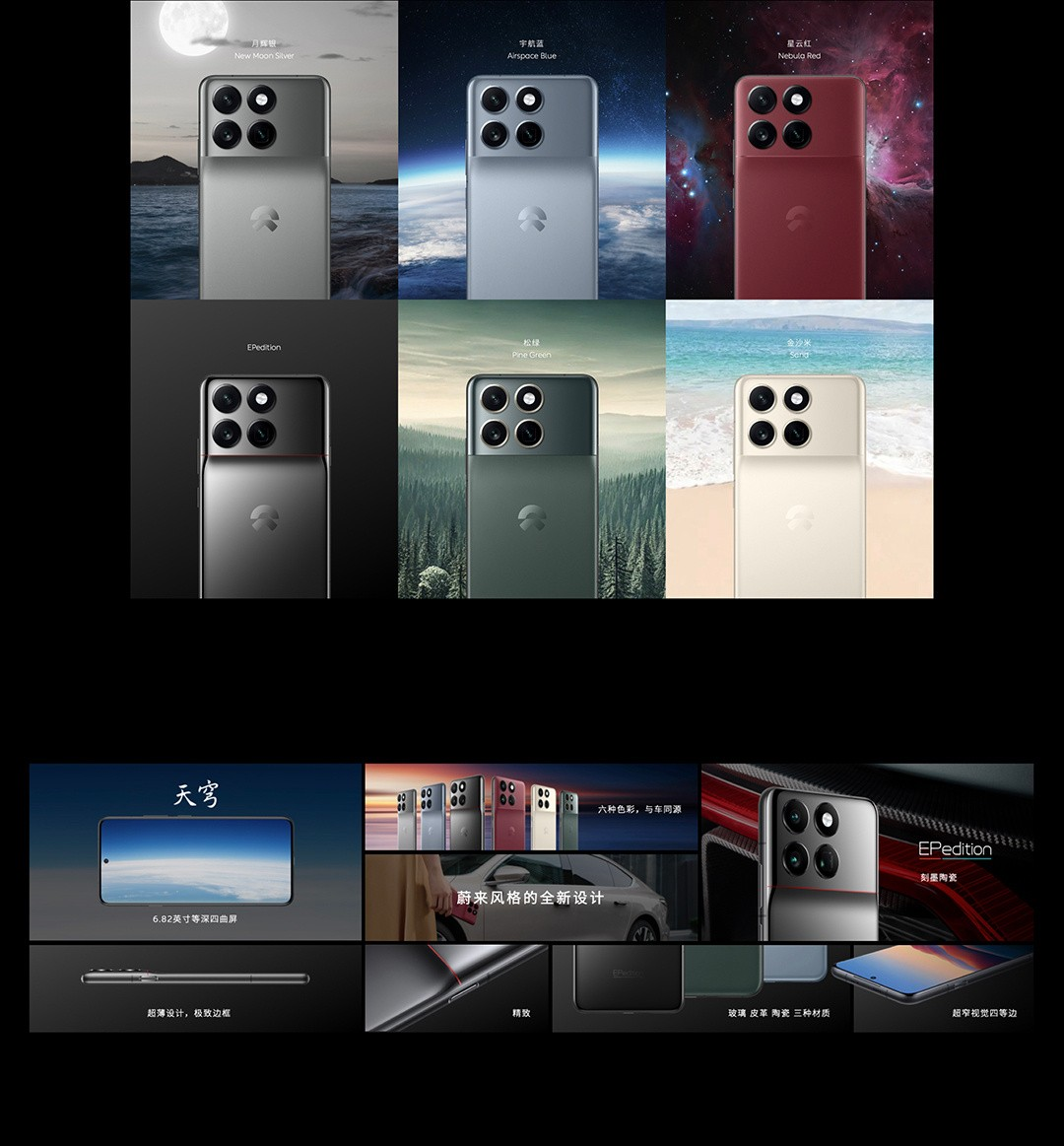 同时,该机还拥有 EP Edition 限定版,背面为“刻墨”特殊陶瓷材质,采用一体纳米微晶陶瓷设计,号称具备行业顶级钟表手工打磨刻墨工艺。这款手机总共提供 3 种材质、6 种配色,与蔚来汽车车身的配色对应。