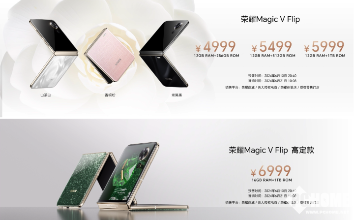 荣耀Magic V Flip拥有山茶白、香槟粉、鸢尾黑、高定款四款颜色,12GB+256GB、12GB+512GB、12GB+1TB、 16GB+1TB四个版本,售价分别为4999元、5499元、5999元、6999元(高定款)。