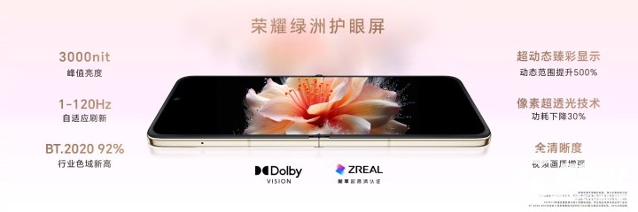 不光外屏素质出色,荣耀Magic V Flip的内屏也堪称旗舰级,内屏尺寸达到6.8英寸,分辨率2520×1080,像素密度403PPI,为影音娱乐、移动办公提供超大视野,采用了行业领先的荣耀绿洲护眼屏,带来零风险级别的全天护眼体验。同时,屏幕素质同样与直板旗舰机看齐,展开后