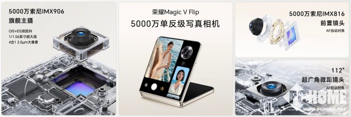 拍照方面,荣耀Magic V Flip后置搭载索尼IMX906单反级写真级主摄,5000万像素,四合一等效像素2.0um,2X焦段下支持光学品质输出;支持写真人像引擎,基础画质、清晰度更佳;支持OIS光学防抖,夜景和运动场景下,拍照更稳;录视频时,0IS+EIS技术联合,进一步减少帧内抖动,视频画面的震颤和抖动更少。