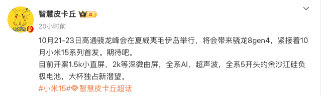 知名数码博主“智慧皮卡丘”爆料称,小米15系列将于10月发布,首发骁龙8 Gen 4移动平台。网络上的资料显示,小米15系列将继续秉承小屏设计理念,搭载一块1.5K分辨率的OLED显示屏。