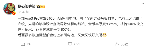 对此,知名数码博主“数码闲聊站”爆料称,一加Ace 3 Pro将首发6100mAh冰川电池,除了拥有全新的硅碳负极材料,电芯工艺也做了升级。由于采用了全新的结构设计,一加Ace 3 Pro的厚度将控制在8mm左右。充电方面,一加Ace 3 Pro支持100W快充,30分钟左右即可充满100%。