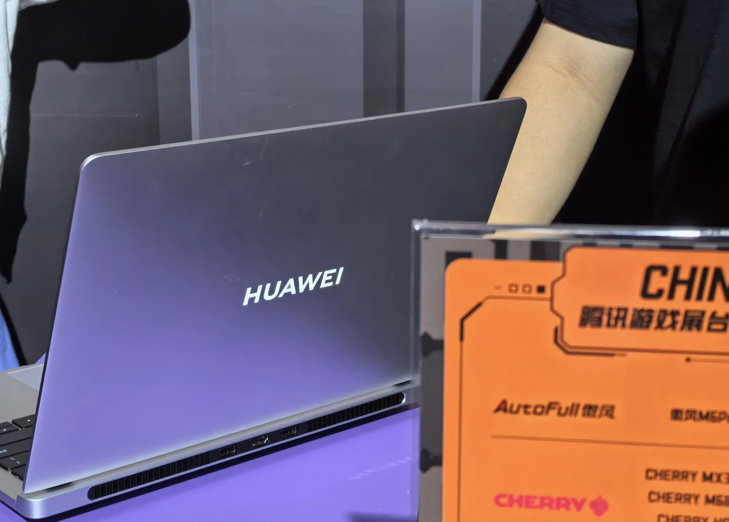 华为新款笔记本于 7 月 26 日亮相本届 ChinaJoy 活动现场,采用全新的 ID 设计语言,LOGO 可发光,使用后直出风,笔记本的底部和包装盒上还印有显眼的“GT”标识。
