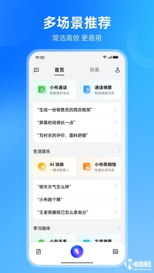 全新的首页中还包括多场景推荐功能,涵盖职场提效、生活娱乐、学习陪伴等多场景,并智能地展示AI功能示例,让使用更加便捷高效。