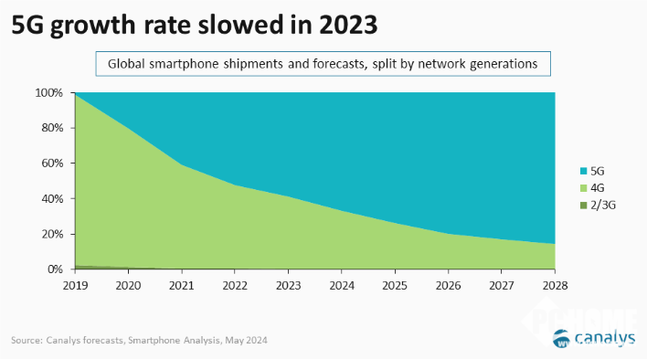 自2019年5G手机开始进入市场开始,5G手机就在不断蚕食4G手机市场。据市场调研机构Canalys数据显示,5G手机在2022年的出货占比就已经超过了50%,但在此后的增长速度开始放缓,预计2024年5G手机的出货占比为67%。