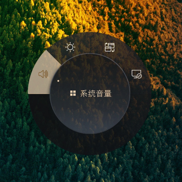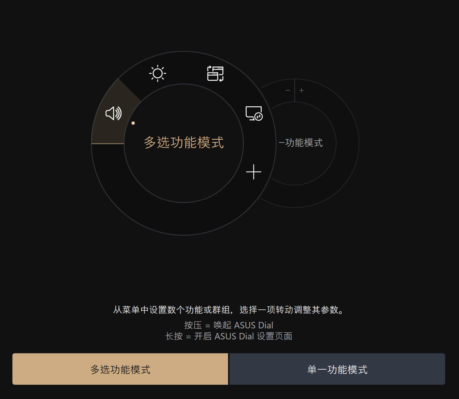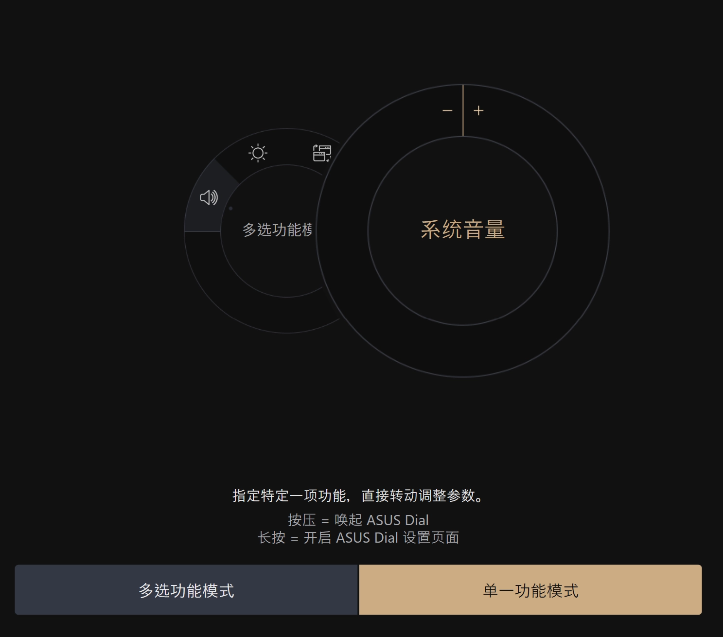 华硕虚拟旋钮默认状态下激活的是系统功能,比如调节系统音量、屏幕亮度、切换桌面等操作。交互方面,华硕虚拟旋钮分为点按、长按和滑动三种交互方式。点按会弹出圆形的旋钮快捷菜单,接着滑动旋钮外圈可以切换功能,切换到对应功能后点按旋钮内圈即可锁定,而长按旋钮内圈则是打开旋钮控制台。