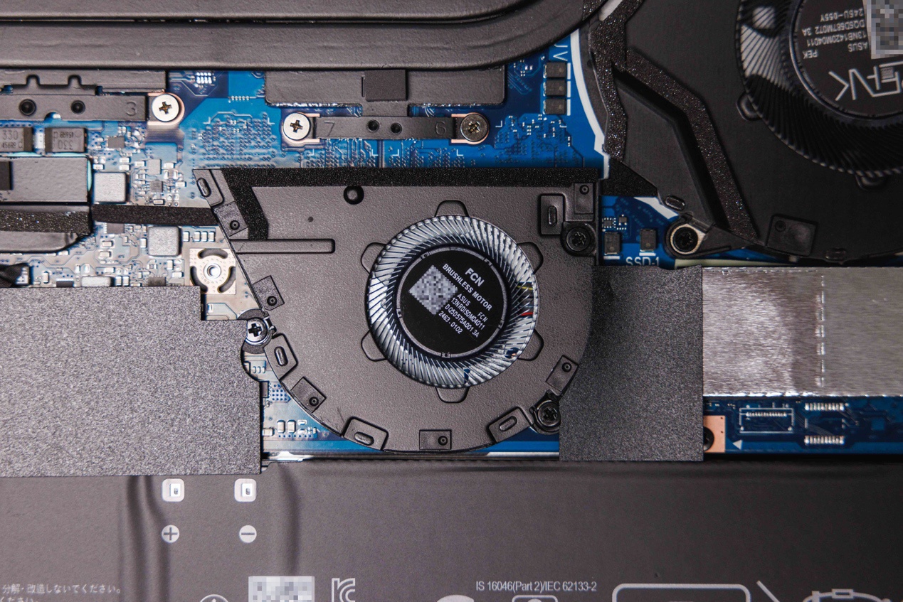 整体采用 4 热管 3 风扇的散热模组,其中这个小风扇采用内吹设计,可以更高效的将内部热量从背部出风口散出。