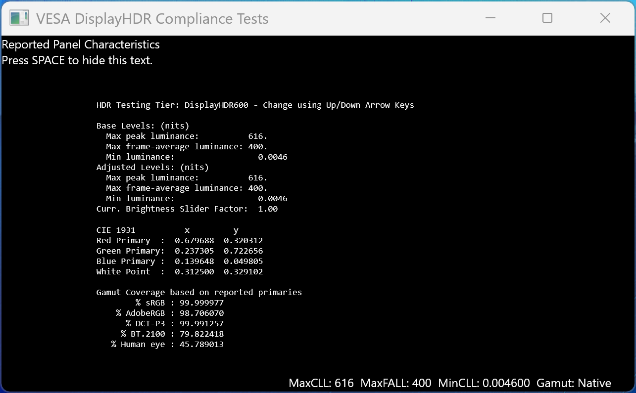 在 Windows 11 系统设置中开启 HDR 模式后,通过 VESA DisplayHDR Test 工具实测,屏幕的峰值亮度则变成了 616nit,在观看 HDR 图片、视频时可以获得更加出色的画面表现力。