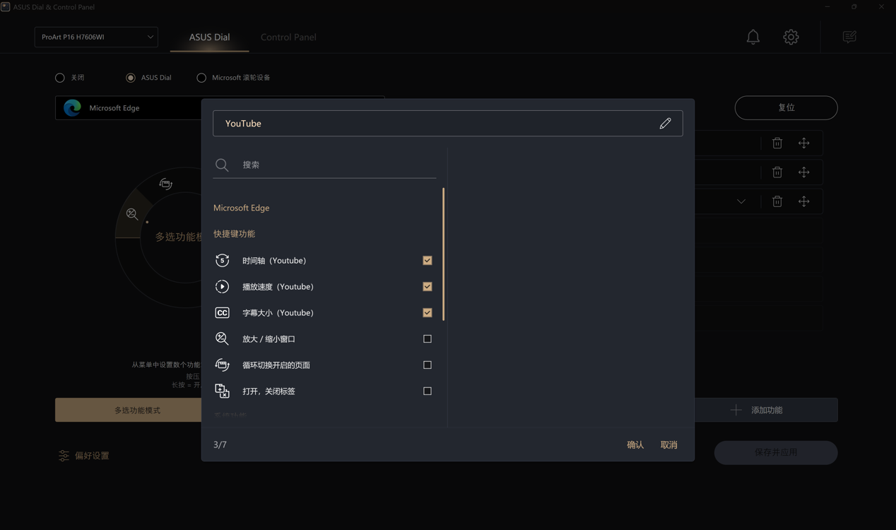 针对不同的软件,华硕虚拟旋钮所适配的功能也会跟着变化,例如 Edge 浏览器中可以实现放大 / 缩小窗口,切换标签页,打开关闭标签页以及一些 YouTube 在线视频的调节选项。