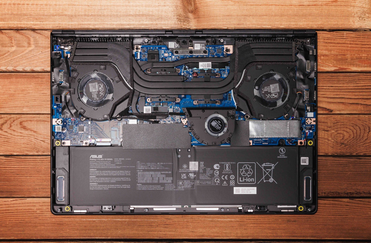 按照惯例,性能测试前我们先拆机看看它的内部散热堆料。需要注意,ProArt 创 16 2024 采用了 3 种不同长度的六角螺丝,顶部还有两颗螺丝外面封着隐藏贴,拆卸时要格外注意。拆下 D 壳后,内部的填充还是比较满的。