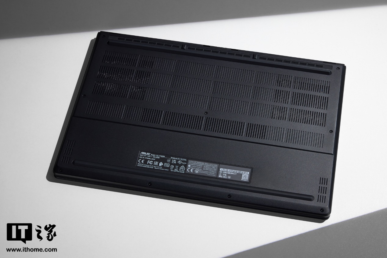 D 壳部分,ProArt 创 16 2024 的进气格栅面积很大,甚至可以透过格栅看到内部的风扇。D 壳四周做了小角度的斜切收边,扬声器开孔被放在底部两侧位置,上下各有一条贯穿左右的长脚垫。