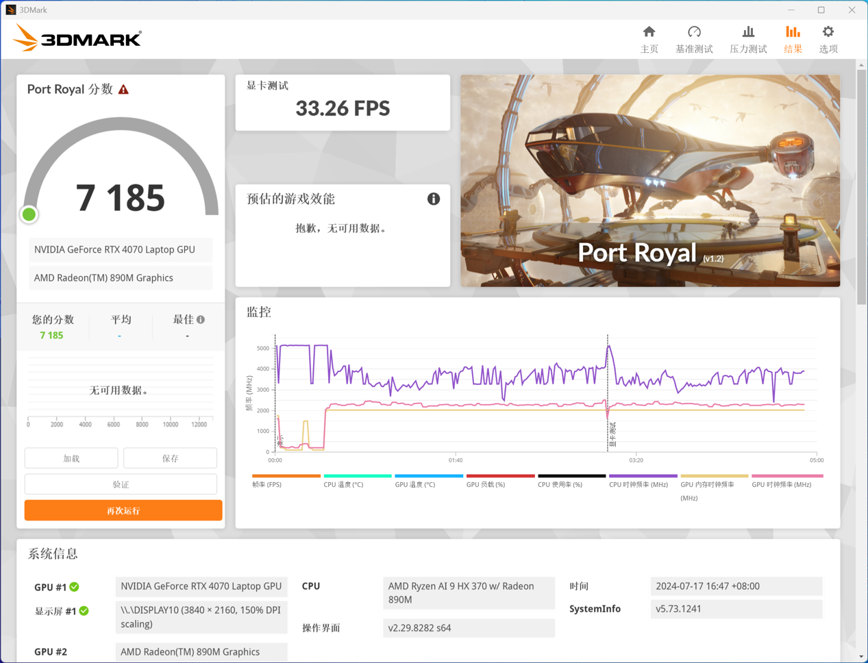 在 3D Mark 的 Port Royal 光追测试中,RTX 4070 综合分数为 7185 分。