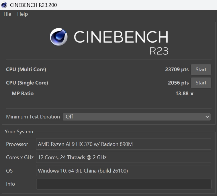 下面进入理论测试环节,在 CineBench R23 的测试中,AMD Ryzen AI 9 HX 370 处理器跑出了单核心 2056 分,多核心 23709 分的成绩,相比上一代 8945HS 处理器的多核成绩(17339 分)领先 36%,相比搭载酷睿 Ultra 9 185H 处理器的旗舰全能本多核跑分(16035 分)更是高出 47.8%,单核跑分方面较之两者也有 200 分以上的优势,性能提升幅度非常大。