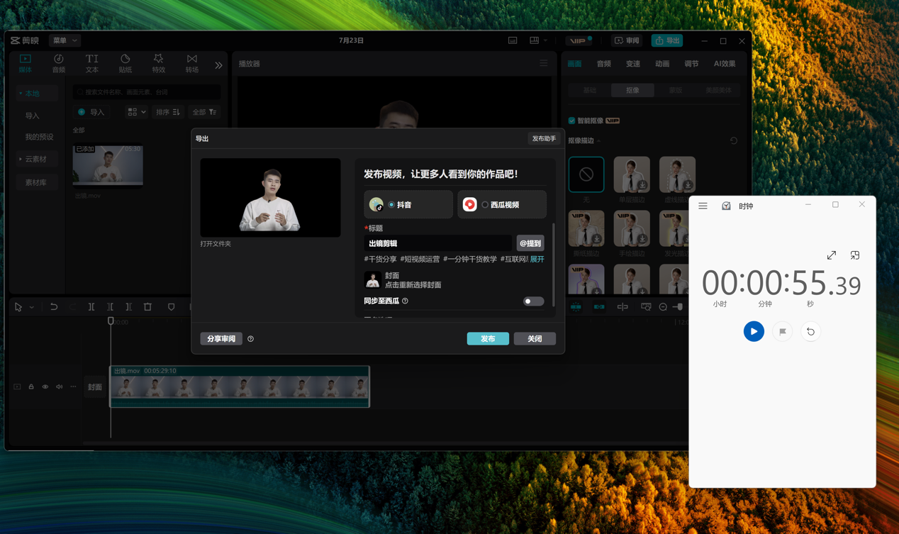 接着,我们将加入其它特效和抠像好的视频通过 AV1 编码进行导出,也只花费了 55s 的时间,相比没有 RTX 40 系独显的轻薄本来说,效率提升了 5 倍以上。