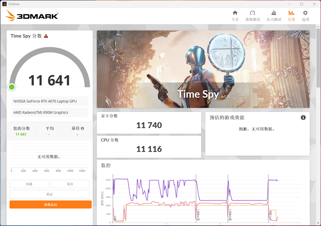 显卡方面,在 3D Mark 的 Time Spy 测试中,CPU 物理分数 11116 分,显卡分数 11740 分。