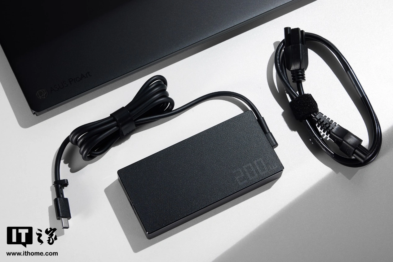 ProArt 创 16 2024 标配了一块 200W 输出功率的黑色电源适配器,接口采用矩形的双面盲插设计。