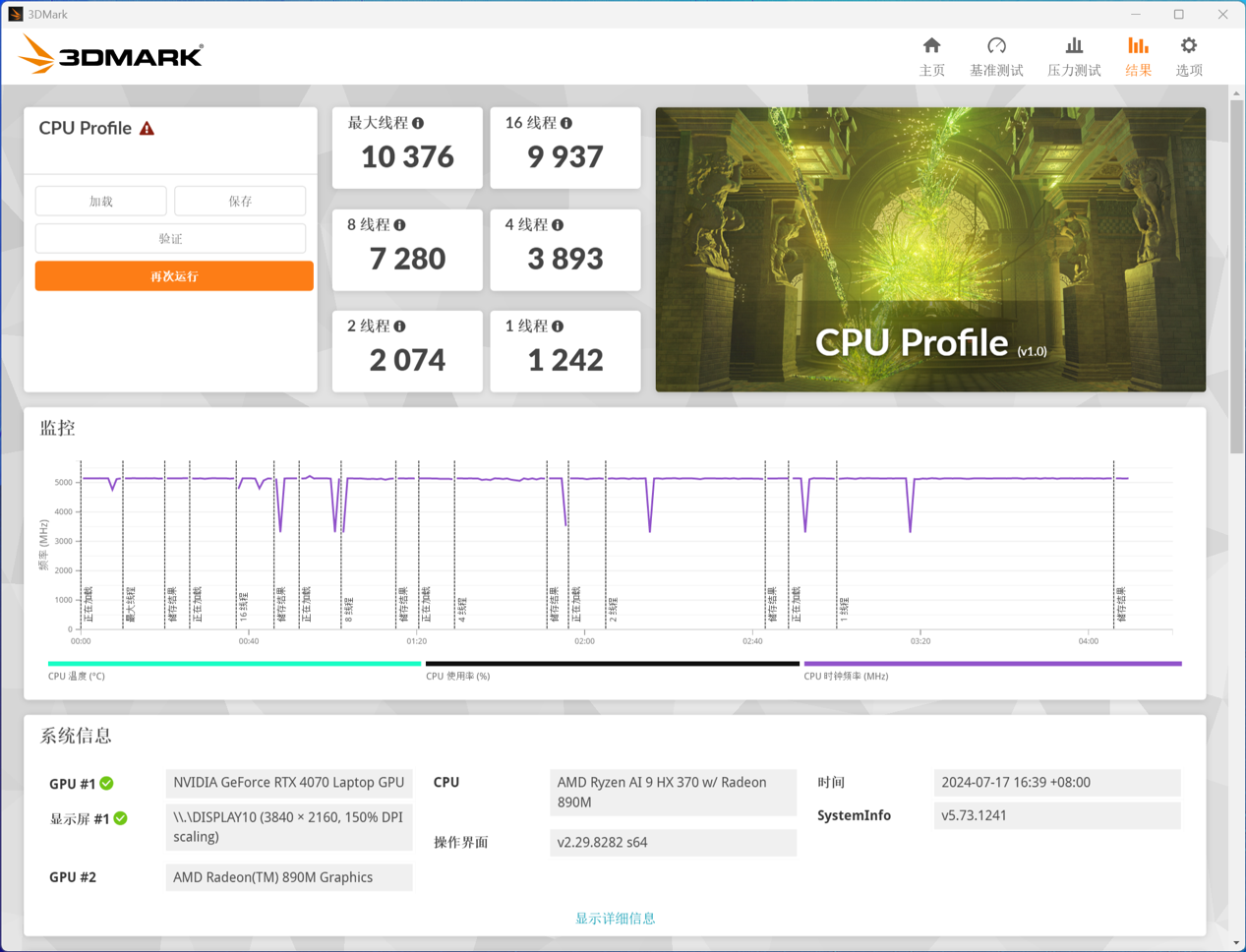 在 3D Mark 的 CPU Profile 测试项目中,单线程分数 1242 分,最大线程分数 10376 分。
