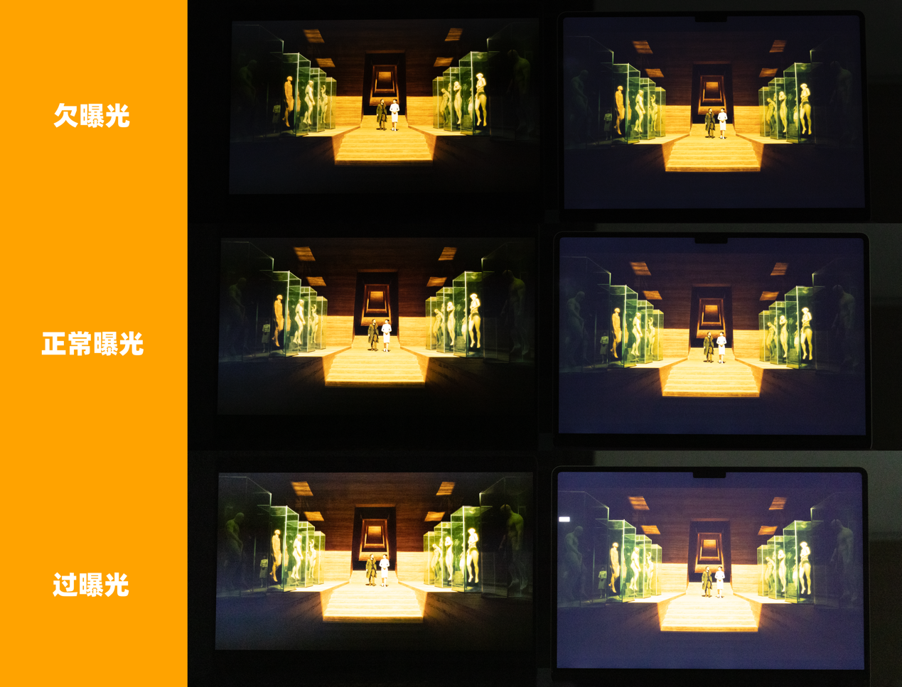 众所周知,由于 OLED 屏幕具有黑色像素不发光的特性,相比 LCD 屏幕在观看 HDR 视频时有着高对比度,黑色纯净,高亮度等优势。我们这次也找来了采用 LCD 屏幕的某品牌高端轻薄本英寸进行了对比,在暗光环境下对同一个 HDR 视频的同一帧画面进行欠曝、正常曝光和过曝三组画面对比,两台机器的屏幕亮度均为 100%。