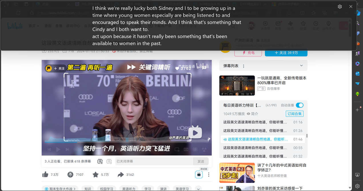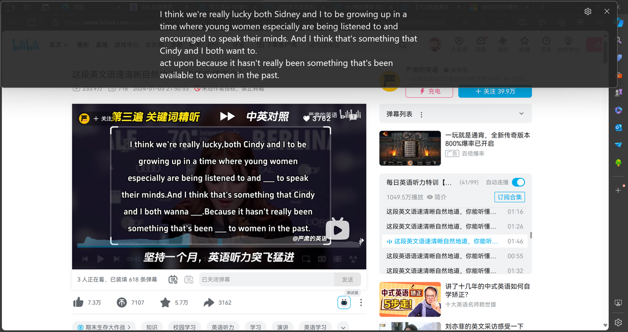 我这里找了一个练习英语听力的B站在线视频,它贴心地把完整文案放在了视频中,而屏幕上方半透明黑色部分则是实时字幕生成的文字,大家可以比对一下识别准确率如何。