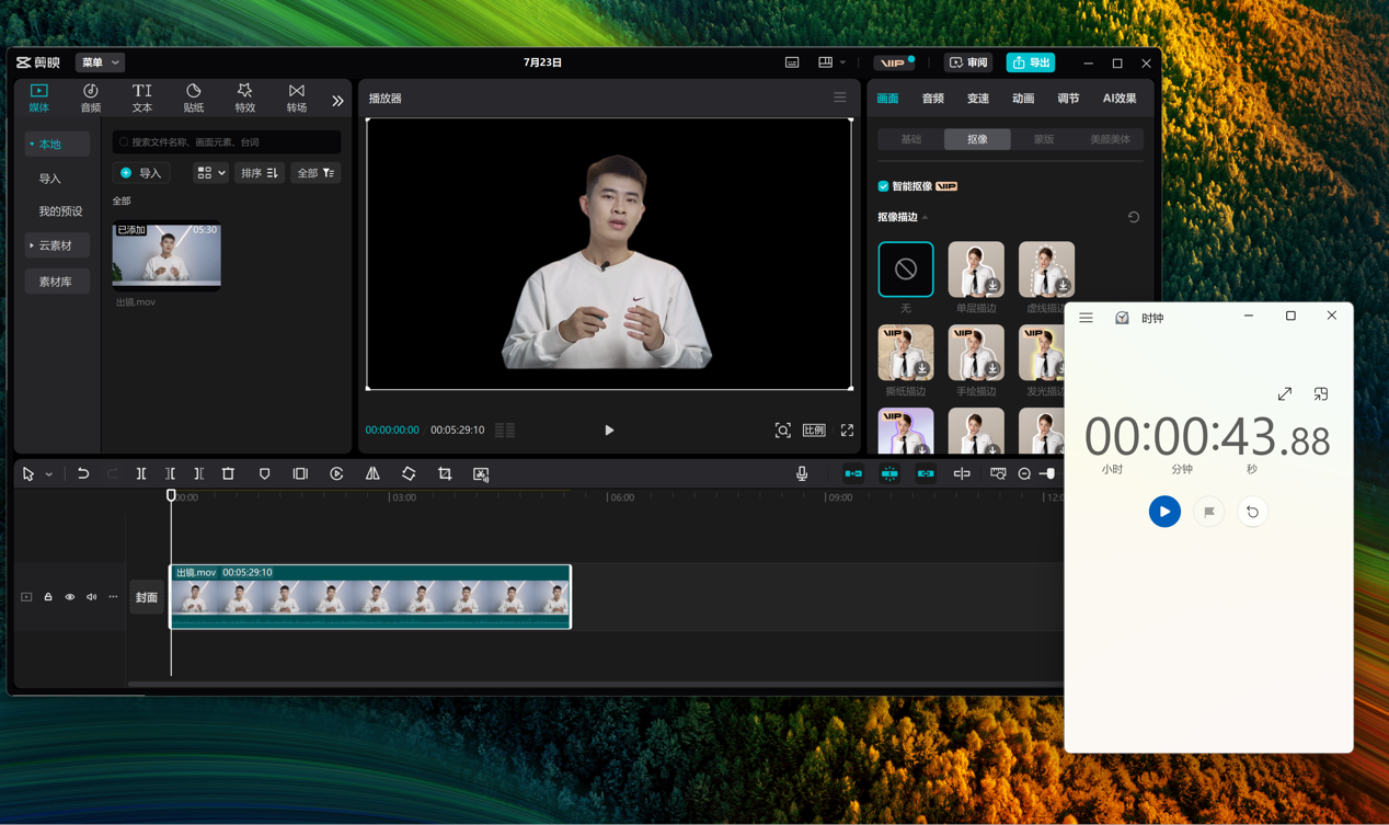 华硕这次与剪映进行了深度合作,所以我们理所当然也测试了剪映视频剪辑的实际表现。我们事先准备了一段时长为 5 分 30 秒的 4K 出镜视频导入剪映,使用它的 AI 智能抠像功能对人物进行处理,并使用 RTX 4070 的 AI 硬件加速,最终花费 43 秒就完成了整段视频的抠像。