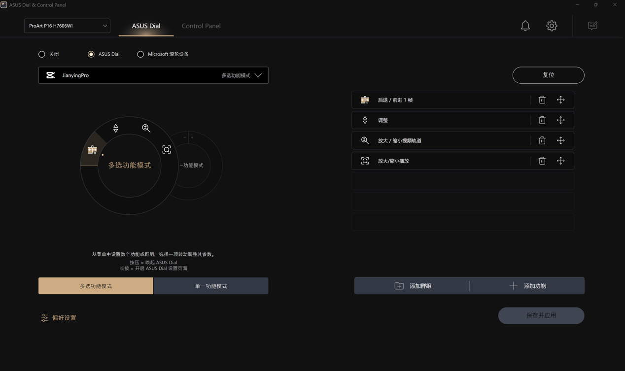 每个软件都支持单一功能 / 多选功能模式两种操作方式选择,用户可以根据自己的使用习惯和需求自行修改,当然自定义功能也是少不了的。整个华硕虚拟旋钮的操作空间不小,熟悉后能够给创作者带来不错的效率提升。